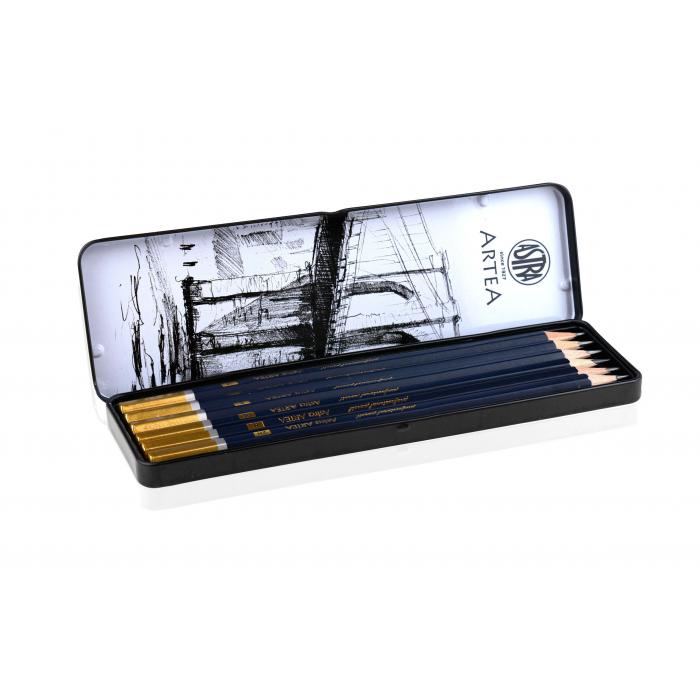 Sada 6 tužek v kovovém pouzdře vhodných ke kreslení, skicování a rýsování.