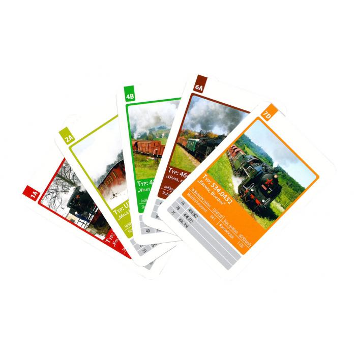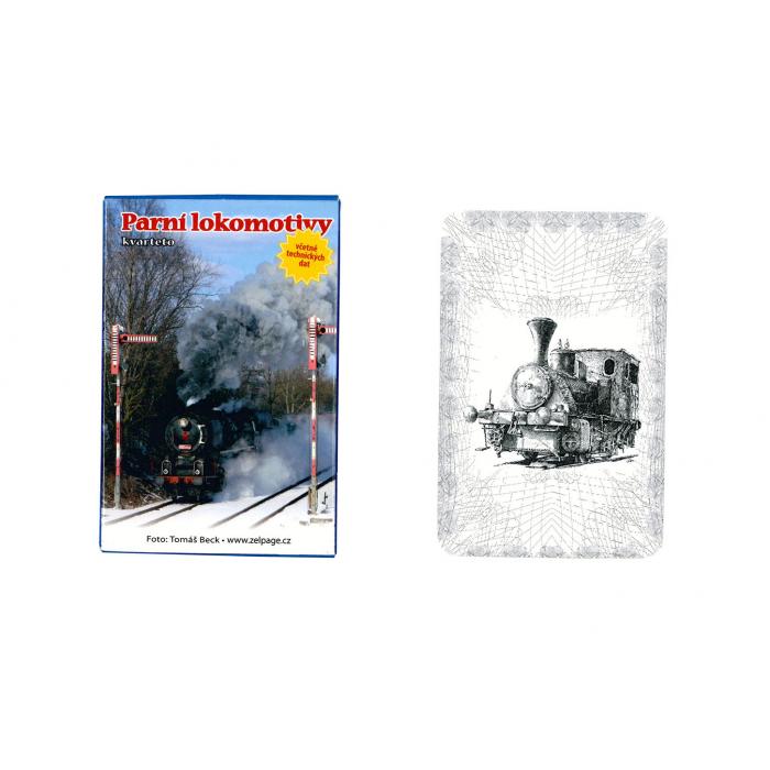 Kvarteto s motivem parních lokomotiv, včetně technických dat.