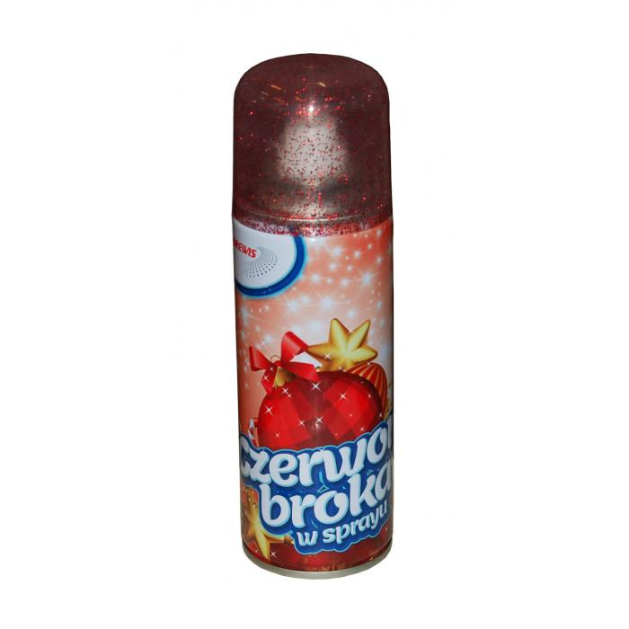 Červený spray s brokátem určený k dekoraci np. na šišky, ořechy, větvičky a jiné přírodní materiály.
