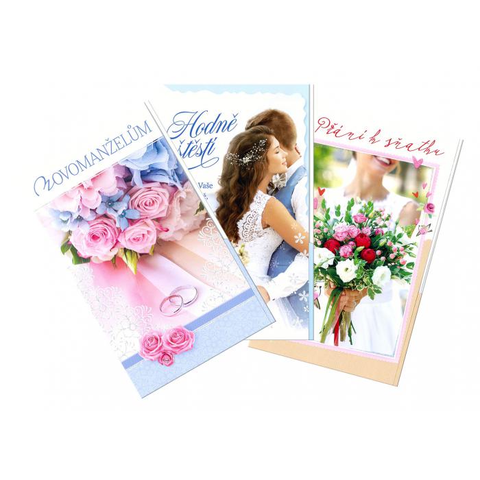Svatební přání s kapsou na peníze, kategorie E, s textem, velikost 19 x 11,5 cm, mix několika motivů.