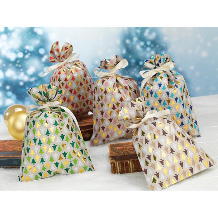 Mix vánočních sáčků Pinea v barvách: modrá, růžová, hnědá, červená, zelená.