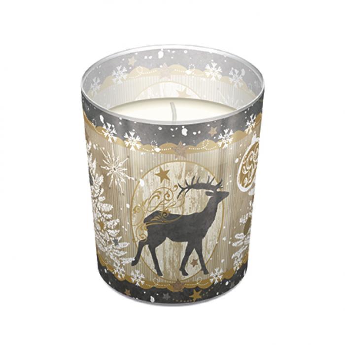 Vánoční svíčka ve skle Royal Deer kat.č:ACG 001701EAN:5906360746631Skladem:NEmin.odběr:1 ksVelikost:v: 9 cm; ⌀ 7,9 cm Výrobce:Paw Vonná svíčka Royal Deer ve skle s vánočním motivem.
