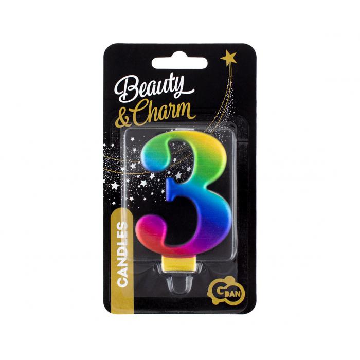 Duhová dortová svíčka č. 3 s metalickým leskem.