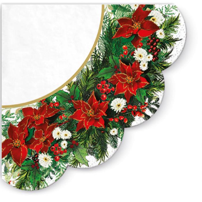 Papírové vánoční ubrousky Paw z kolekce Poinsettia Wreath - bílé, 12 ubrousků, třívrstvé, ø32cm(round).