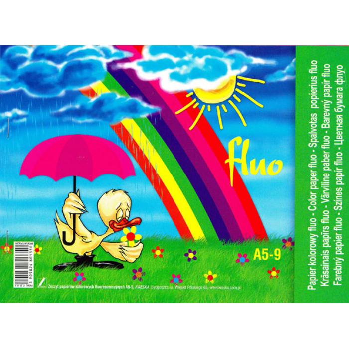 Barevný papír - Fluo A5 EAN:5905824801350Skladem:ANOmin.odběr:1 bal. po 20 ksVelikost:A5 Výrobce:Kreska Sešit obsahuje 9 listů barevného fluorescenčního papíru.